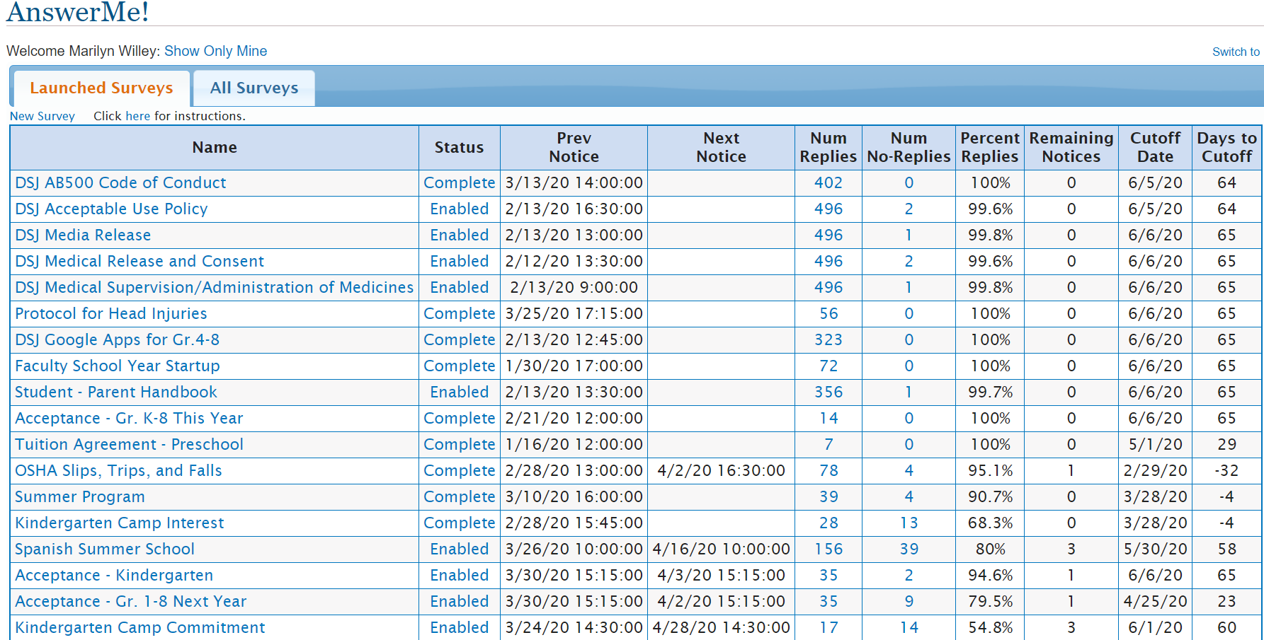 - Group surveys by user-defined categories (e.g. Grade 3, Field Trips, Sports)