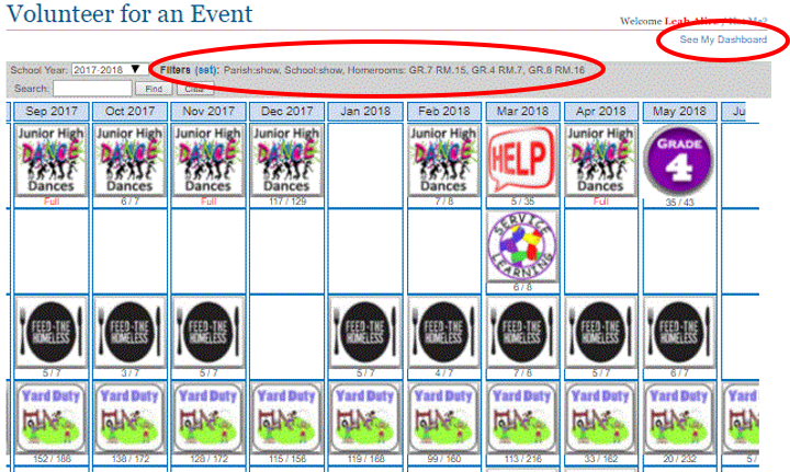 - The home page shows icons of the event, with the # of volunteers signed up/total needed.