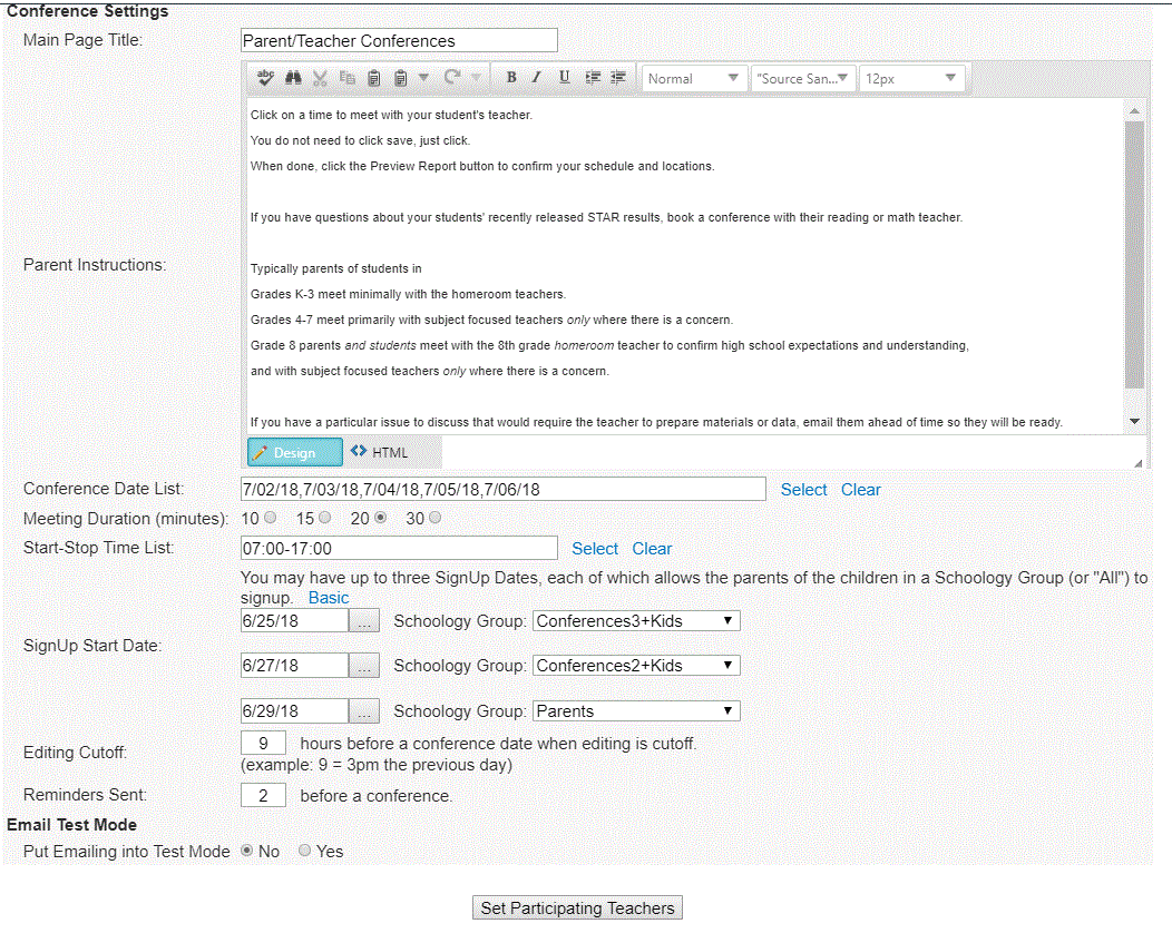 - Set which teachers are participating and their conference location.