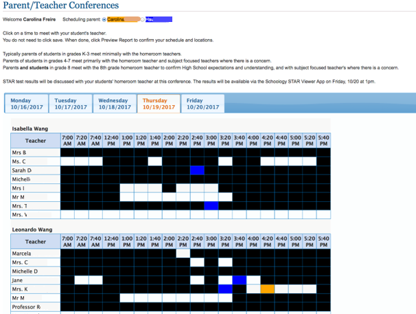- Click times that work; error-checking if same time slot selected for another teacher.